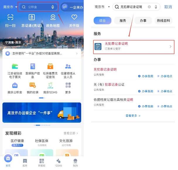 1.登录“苏服办”APP,在首页搜索“无犯罪记录证明”,进入服务。