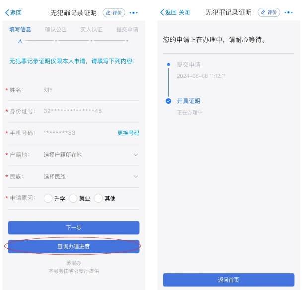 4.点击“查询办理进度”,可查询办理进度。