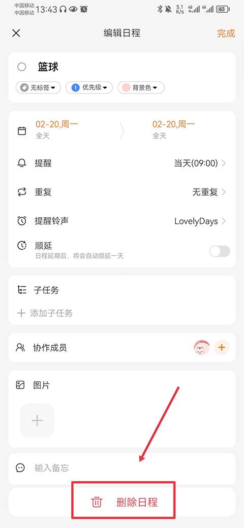 2、点击后即可进入编辑日程界面,然后点击下方的删除日程即可删除
