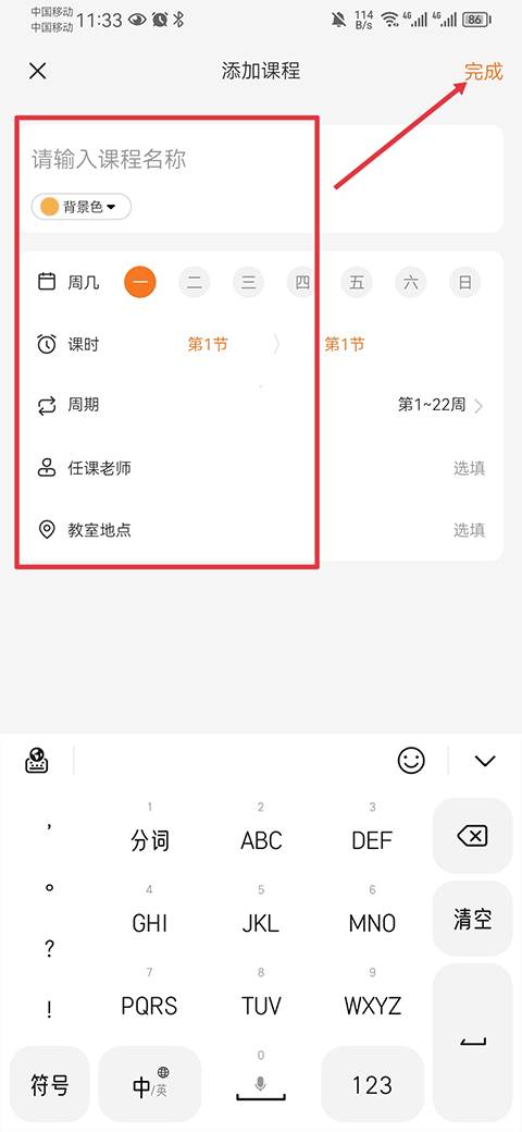 4、最后将课程名称、周几、课时、任课老师、教师地点等信息完善后点击完成即可
