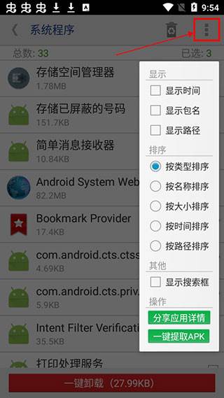 4、也可以点击右上角的按钮,进行多项操作,比如一键提取apk、分型应用详情、显示时间包名路径等等;