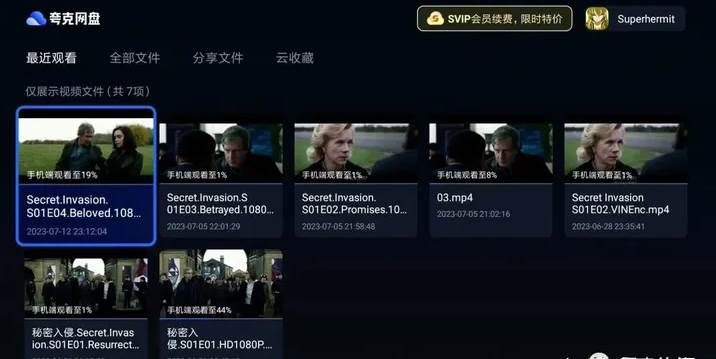 2、夸克网盘TV端界面整洁、美观,分为最近观看、全部文件、分享文件、云收藏四个主要版块,使用电视遥控控制,选择需要的版块即可。