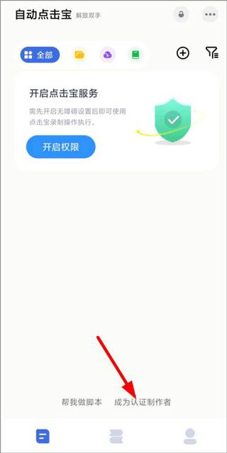 1、打开自动点击宝官方版,包括主页、使用教程、我的等版块,点击下方成为认证制作者;