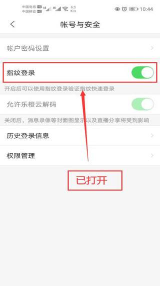 4、然后,点击打开使用指纹登录功能开关。