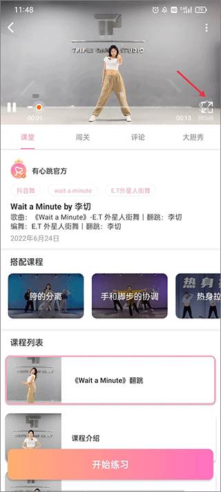 2、会看到舞蹈视频教程的播放,点击视频区域的放大功能;