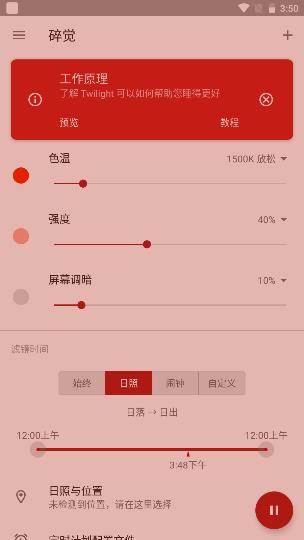 薄暮微光(Twilight) 应用使您的设备屏幕适应一天中的时间推移。它会在日落后过滤掉您手机或平板电脑屏幕上的蓝色光谱,并以柔和而悦目的红色滤镜来保护您的眼睛。滤镜的强度会根据您所在地日出与日落时间 的日照周期而 平滑地调节重要提醒