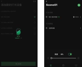 4添加新的灯光设备。打开您创建的场景,点击绿色“+” 按钮,然后点击“新设备”,App会自动为您扫描可以连接的设备。您可以连接并控制出现在您设备列表中的灯光设备。