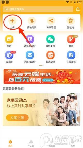 1、下载并打开联通云盘app,来到主界面找到“上传”选项并选择。