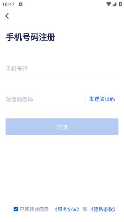 4、无账号,点击注册,输入手机号和短信动态码注册