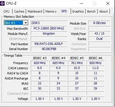 此处可以查看内存厂家及容量、内存生产周期(week/year)、内存序列号(part serial number)、内存时序表及内存电压。