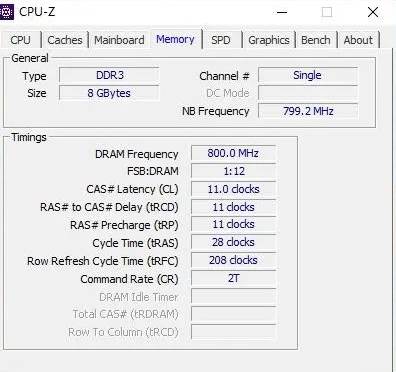 type:表示内存型号是DDR3,channel通道状态是单通道,size指内存容量是8G,DRAM Frequency表示内存等效频率是800MHz,实际内存是1600MHz的内存。剩下的表示内存的时序状态。此电脑用的是单通道(单条内存)8GB 1600GHz,内存时序是:11-11-11-28。