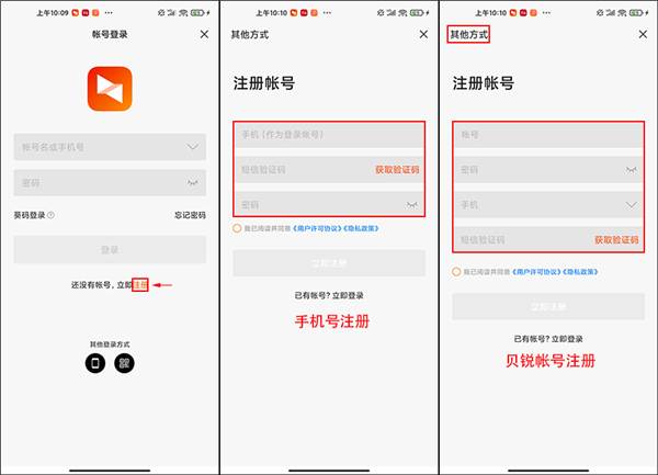 若未注册帐号,点击下方的“注册帐号”,其注册方式有手机号注册、贝锐帐号注册两种。同意贝锐用户许可协议及隐私政策后,根据界面要求输入所需信息,注册帐号后登录。