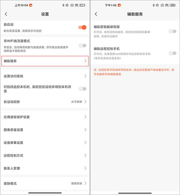 (3)远控方式:设置以下任一方式即可远控本机 。 ①辅助服务,开启后无需获得root权限即可远程(需手机系统本身支持)