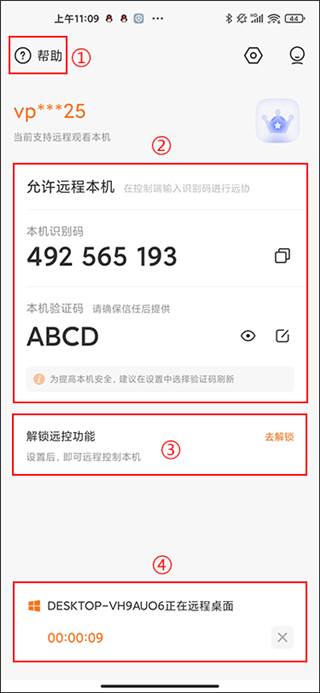 ①识别码:用于远程协助,支持复制,控制端可键入该识别码进行远程控制。