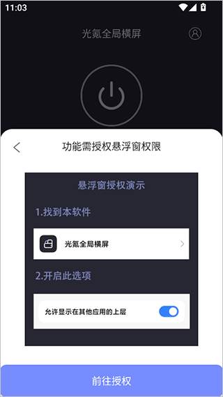 1、在首页点击电源图标形状的开关按钮,触发悬浮窗权限授权提示