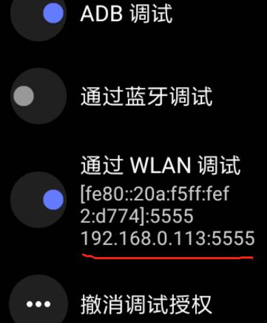 7.点击【通过WLAN调试】,并记住对应的IP和端口号。下图的连接地址是192.168.0.113,端口号是555
