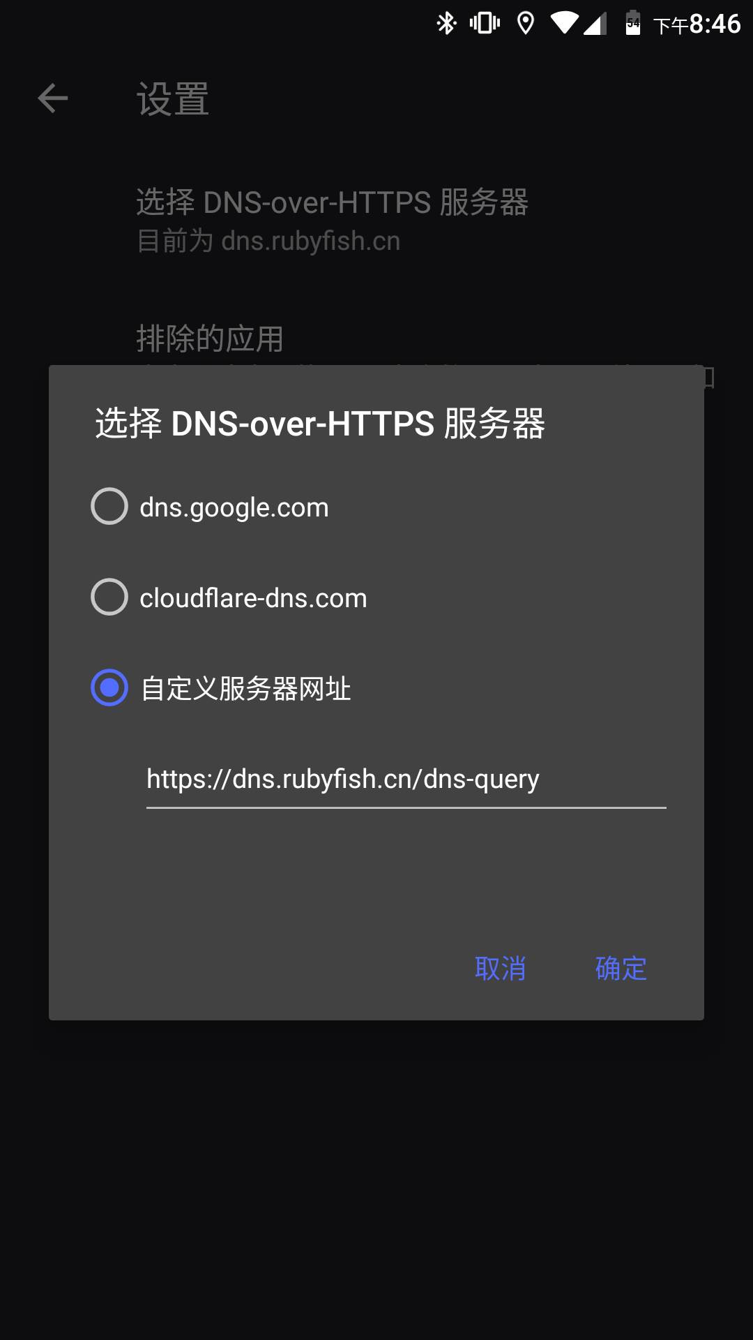 第三步:填写红鱼的 DoH 服务 URL,https://dns.rubyfish.cn/dns-query,点 OK 保存