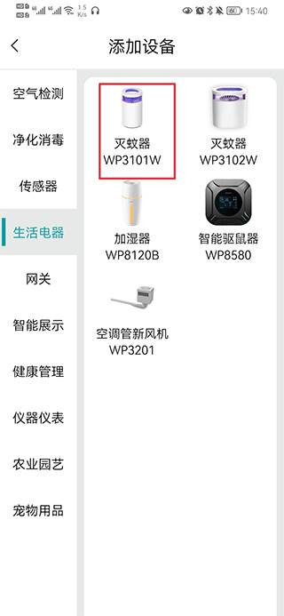 2、选择要添加的设备与型号,如灭蚊器 WP3101W;