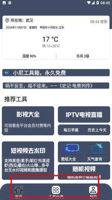 下载安装小尼工具箱app,打开同意相应的权限,进入首页;