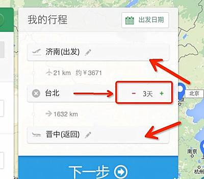 2.在出来的城市中,选中台北市,点击加号添加,在弹出的“我的行程”中,先选择出发城市和回来的城市,然后中间的目的地选择天数。这里以只游玩台北市为例。还有其他城市,则回到左边的城市中继续添加到你的行程中。