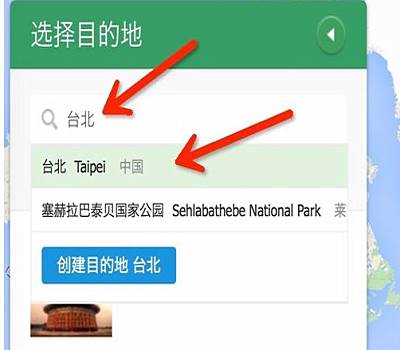 1.进入行程制定的页面,首先在左上方的框里输入要去的目的地,以台北为例,输入台北,在下面显示出来的提示框中选中台北。