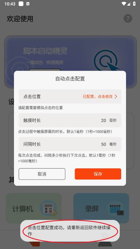 6、当提示点击位置配置成功之后,就可以返回软件使用了。