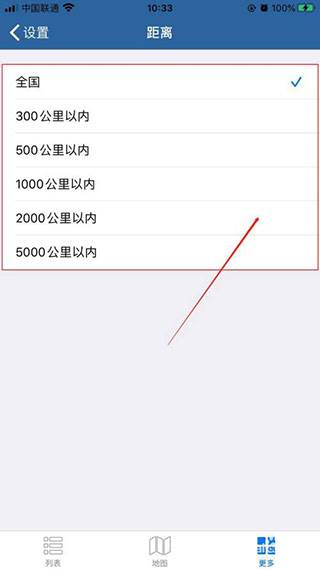 5.在“距离”的列表界面中,选择全国或距离多少公里以内即可。