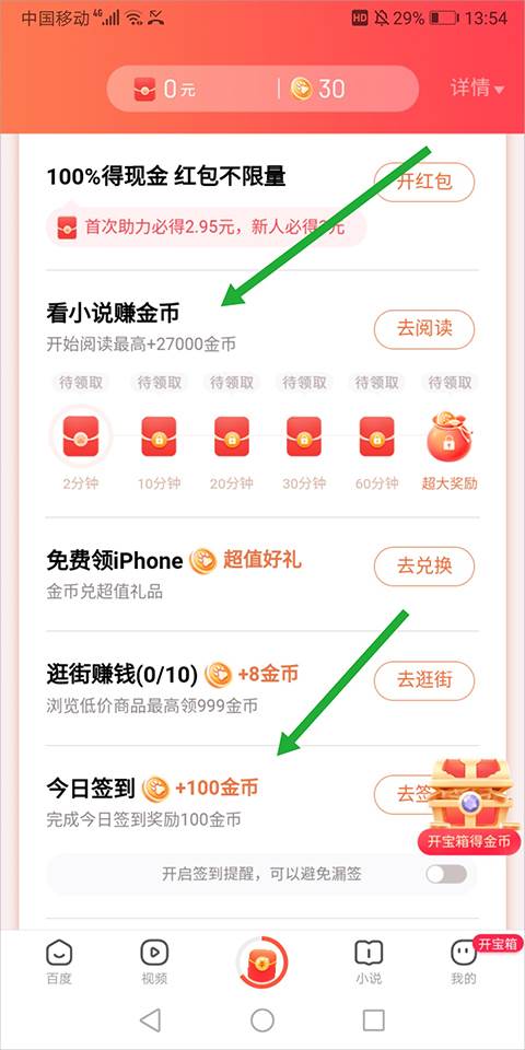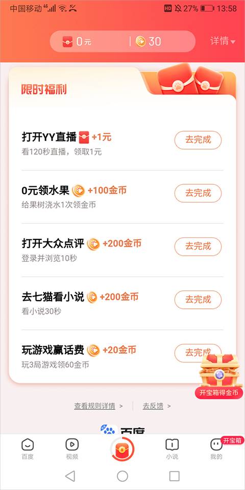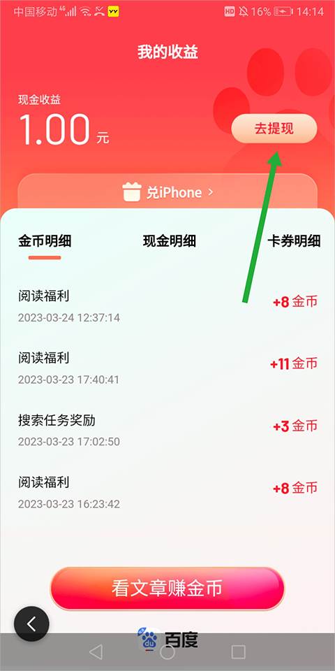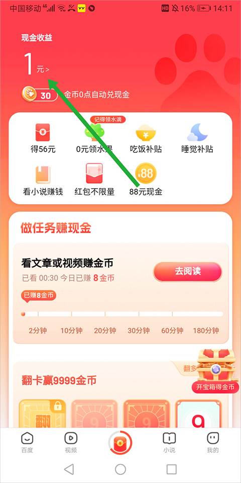 点击下【去阅读】,进入百度首页阅读任意资讯就可赚钱金币,阅读时长越长赚取的越多