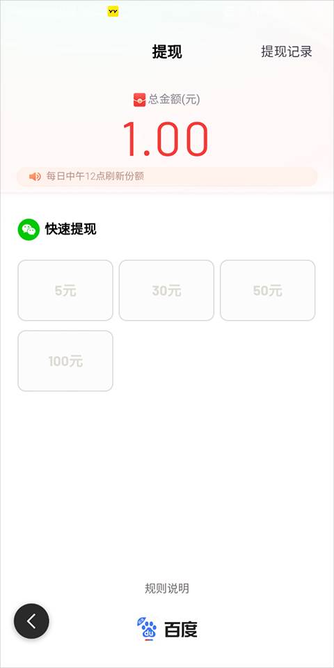 3、如果提现金额未达到提现方式的提现金额档位中最低档位(这里微信提现方式中最低档位是5元)就不能实现提现,需要用户继续做任务来提高提现金额