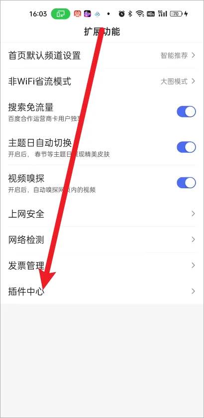 最新版本的百度浏览器已经下架了整个插件中心功能,所以红包插件也就没有,下面两张图分别是最新版和老版本的百度浏览器扩展功能里的功能选项,用户可以对比发现第一张最新版本的扩展功能中没有插件中心功能了,而老版本是有插件中心功能的