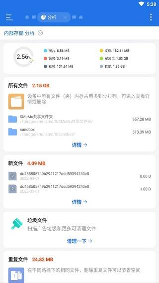 打开快捷导航—工具—文件分析器,能够显示sdcard总容量,已用可用容量,各个文件夹/文件的大小、占比、所包含文件/文件夹数量,长按可以直接删除。点击地址栏可以切换内置外置卡。点击目录分析,可以显示当前路径下的图片、音频、视频、文档、安装包、其他所占容量的情况。