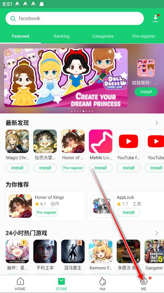 1.打开APKPure,点击底部的Me,点击右上方的小齿轮进入设置