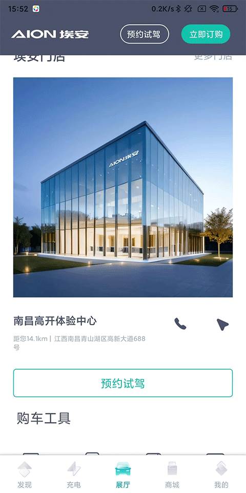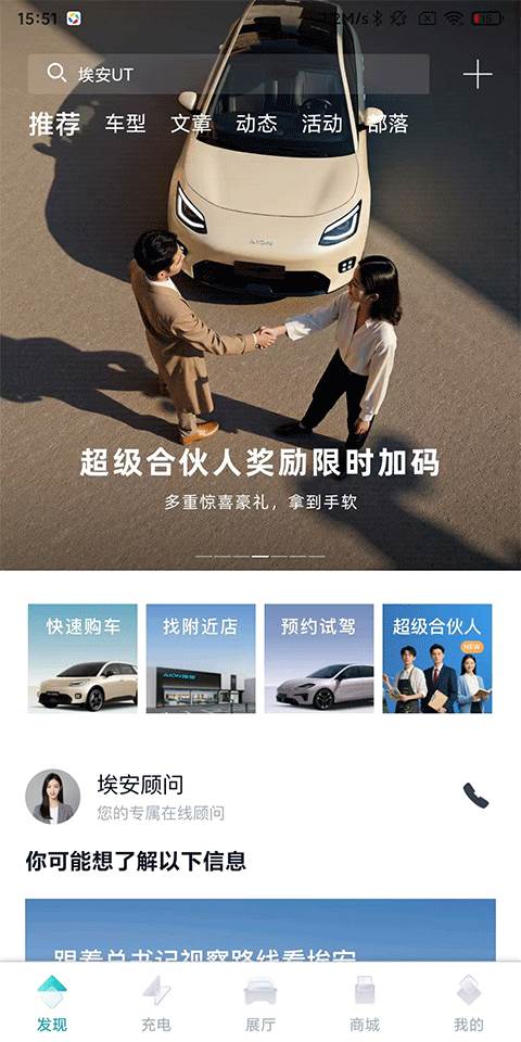 1、打开埃安APP,在首页可以浏览搜索埃安汽车相关资讯文章,还有快速购车、找附近店、预约试驾等服务;