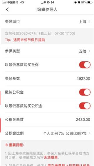5、参保类型选定后,默认【以最低基数购买社保】,参保基数默认为4927(可修改),如需缴纳公积金(不缴则忽略),将【缴纳公积金】灰色按钮点亮,同默认【以最低基数购买公积金】,如图所示公积金基数为2480(可修改);
