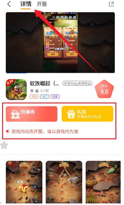 2、点击一款游戏的封面,可以进入到游戏详情页,了解游戏的开服活动,优惠券以及专享游戏礼包等;