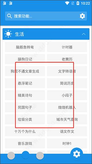 2、点击下方的小球球即可切换界面,显示为绿色的小球就是你当前所在的界面,在这里提供了生活、工具、极客三大类工具,点击右侧剪头即可展开查看详细功能,同时也可以再上分的输入框中输入关键词来快速查找使用功能;