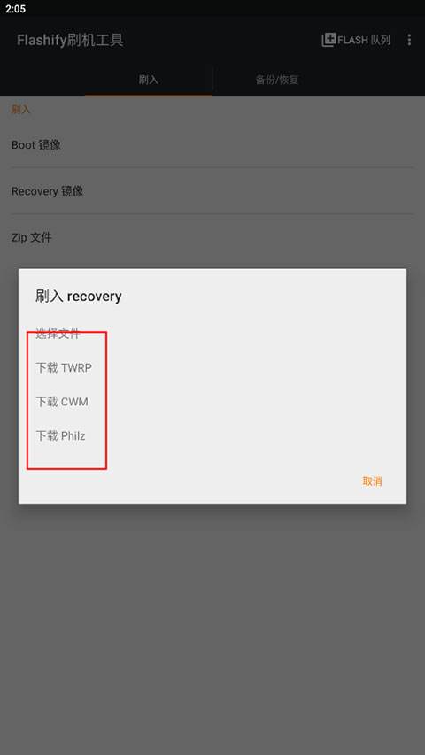 1、进入flashify,点击“Boot镜像”、“Recovery镜像”或“Zip镜像”;