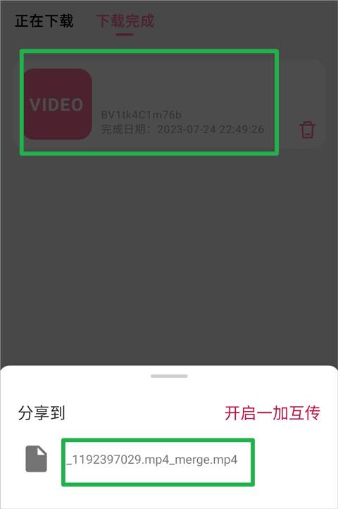 5、在下载界面内可以查看我们视频下载的进度,视频下载完成后还可以分享到手机文件夹内