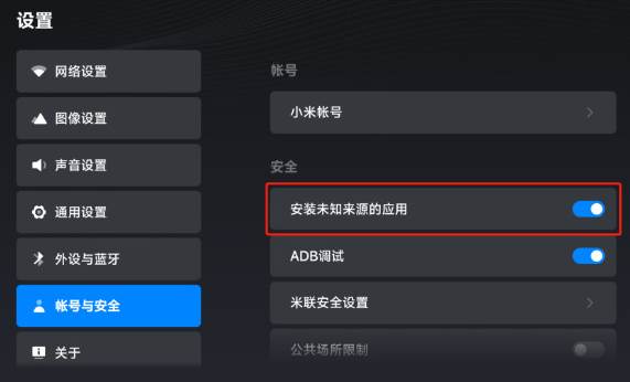 2、在小米盒子的【设置】-【账号与安全】里,选择允许安装未知来源的应用。