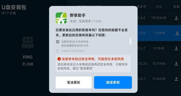 U盘安装应用:用户只需将下载好的APK文件拷贝到U盘中,然后将U盘插入电视或机顶盒的USB接口,即可通过野草助手快速安装应用。