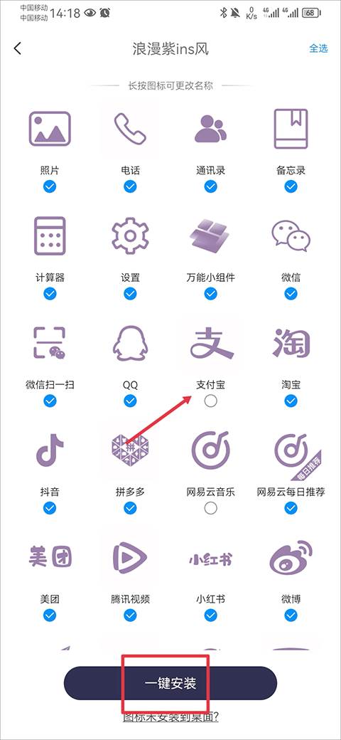 3、然后点击一键安装即可,若有图标不想更换时,可以将勾选去掉