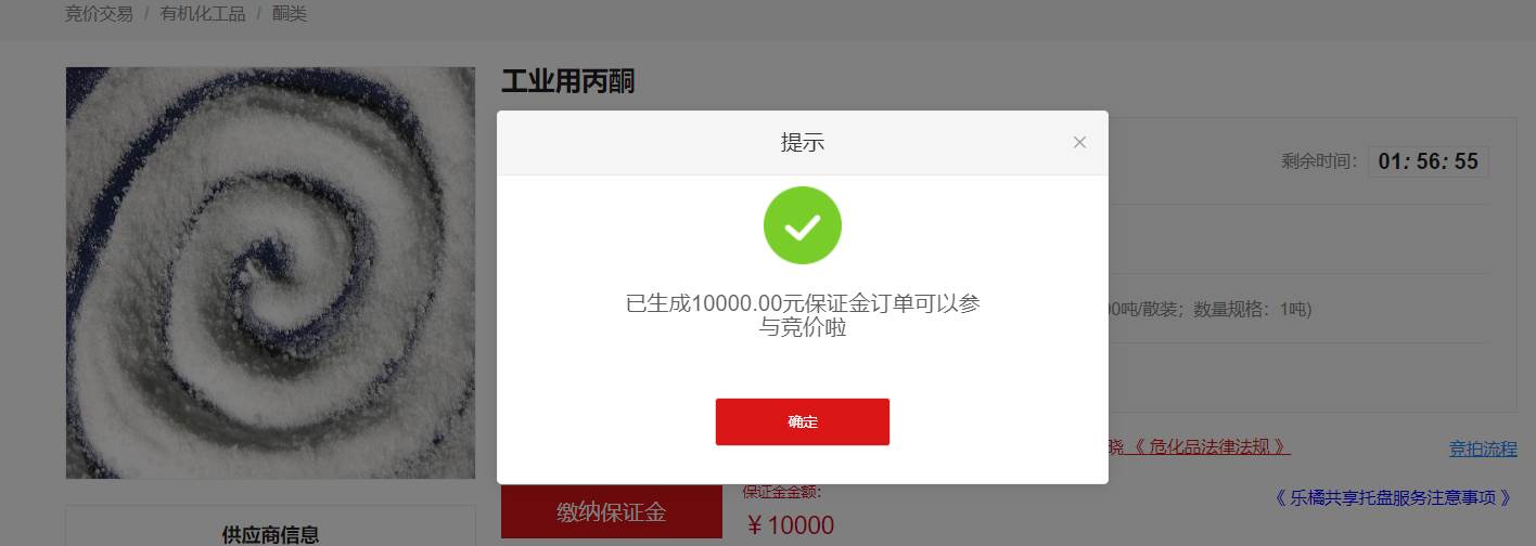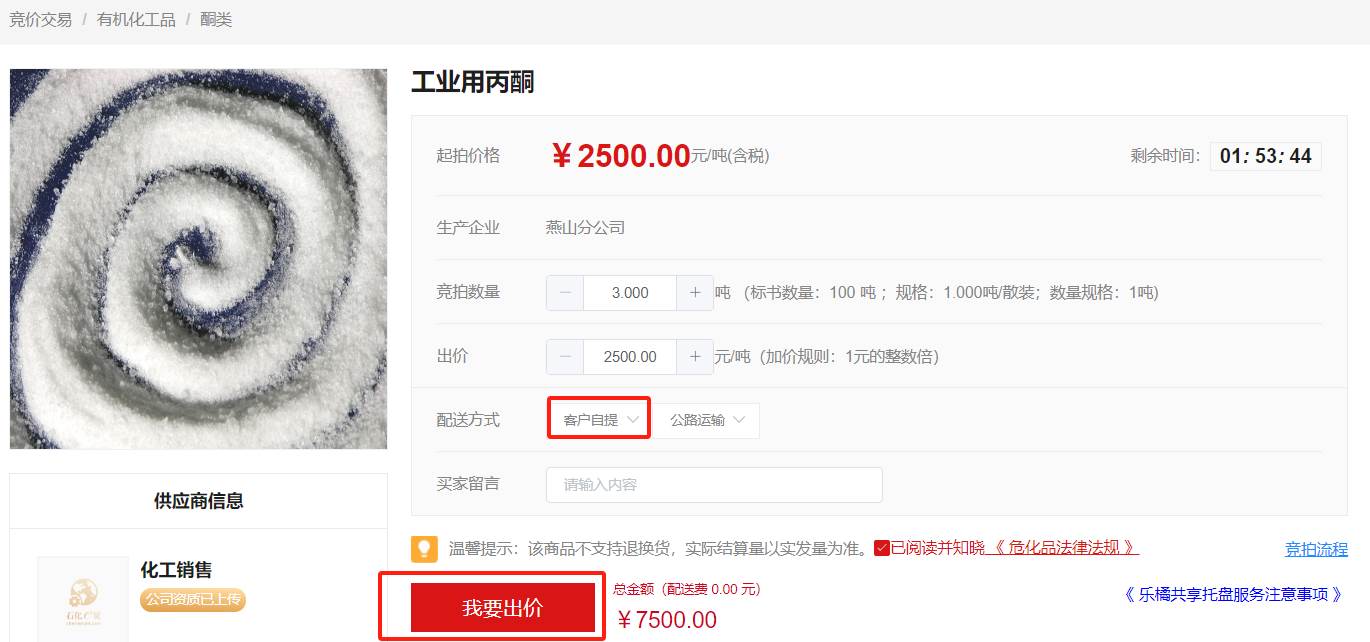 1)若配送方式选择为“自提”,直接点击“我要出价”,确认本次竞拍的竞拍数量、竞拍价格,以及总金额等相关信息;