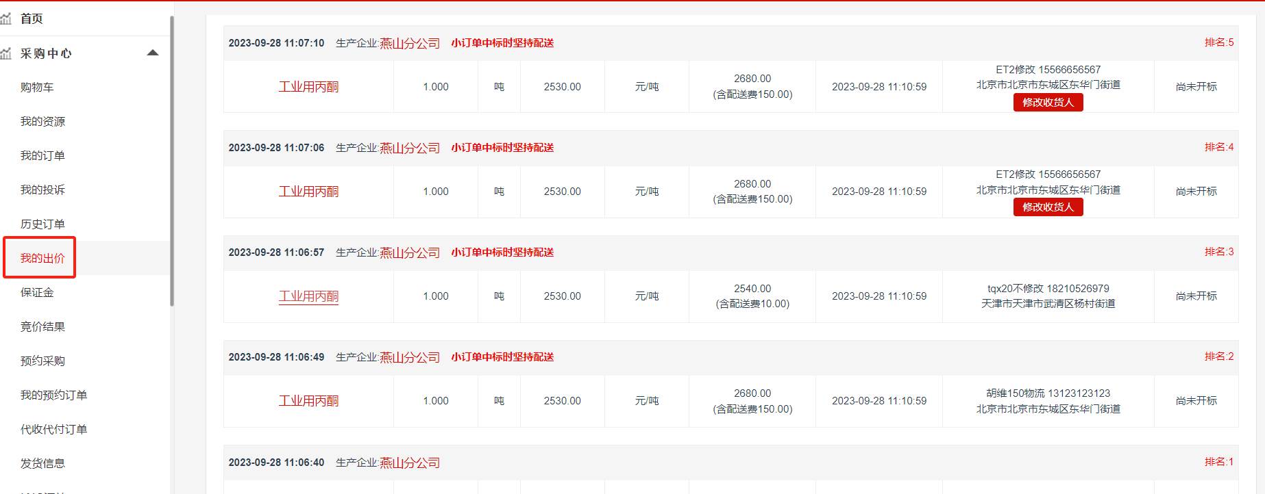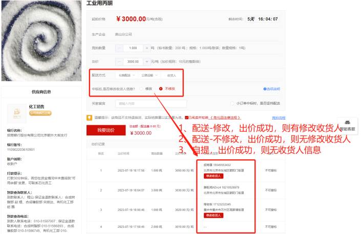 出价成功后,出价记录有数据记录;开标后,配送方式和收货人信息,只能在未支付状态下成功修改一次,已支付或被成功修过一次的条件均不可被修改;