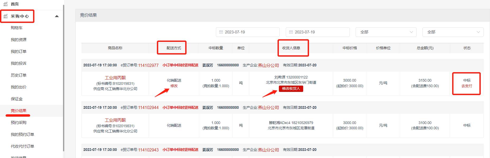 竞价开标后,查询中标和订单情况。可以看到,如中标后选择了“配送且中标后可修改收货人”的订单,则需手动点击“去支付”按钮进行支付;若选择“自提”或“配送但中标后不修改收货人”,中标后自动扣款生成订单,无须进行操作。