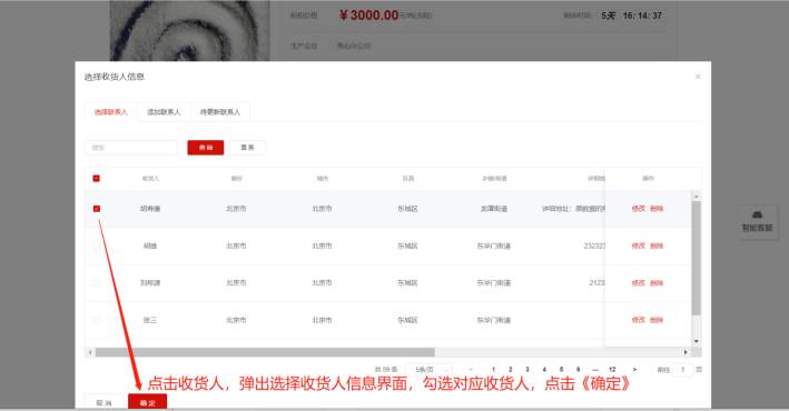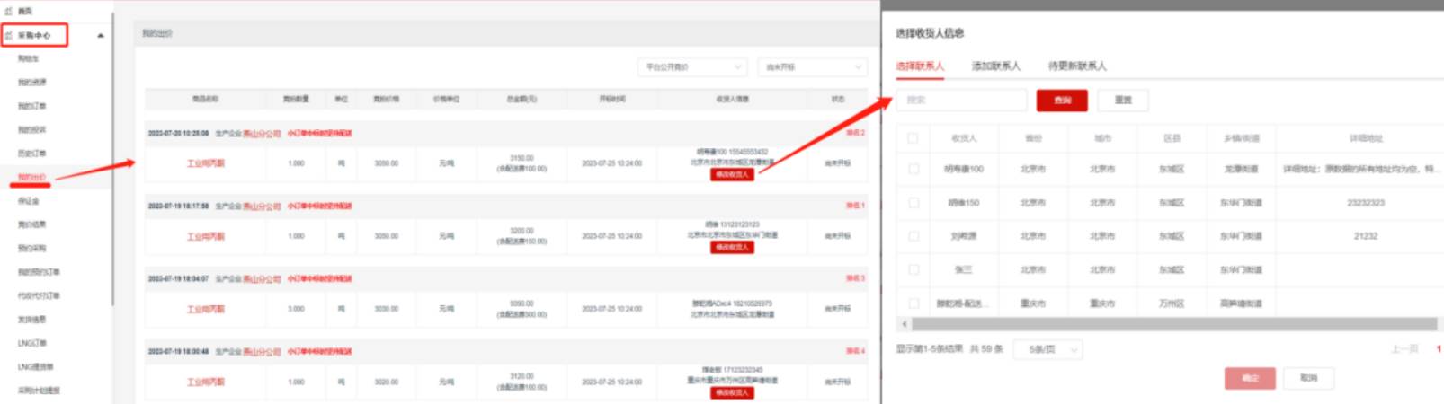 【路径】买家中心-采购中心-我的出价,点击《修改收货人》弹出选择收货人信息界面。