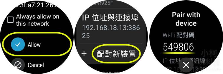 我发现以往手表要使用ADB调试必须关闭蓝牙及LTE连线,Wi-Fi才能连接手机,但使用新的无线侦错的经验里,不需刻意关闭蓝牙及LTE连线,就会自动开启Wi-Fi并自动连线(但还是得确认手表及手机是连线到同一台无线Wi-Fi路由器)