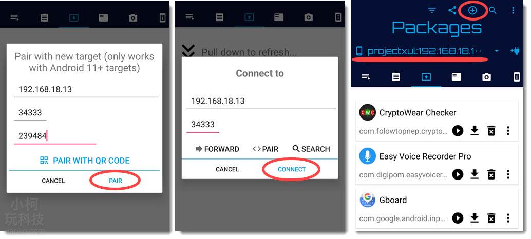 请依手表上出现的配对码输入; 再按PAIR→ 此时再对照一下手表及手机上的 Port 号是否相同,再按Connect。 只要看到中间的蓝子字串上出现 192.168 开头的数字即代表已连线成功。 若要传送 APK 到手表上,请按屏幕顶端的+ 图案