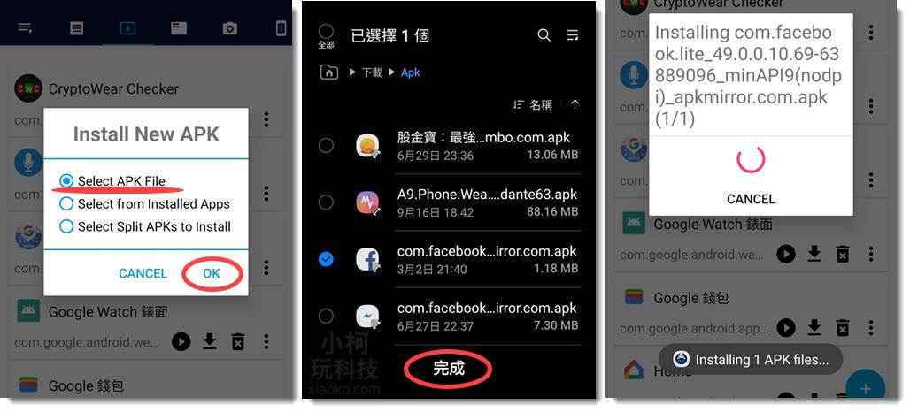 选择 Select APK file (也就是选择 APK 文件) 按OK → 接下来请在手机下载的文件夹中找到要上传到手表的 APK 文件 → 手机就会开始传送 APK 文件。