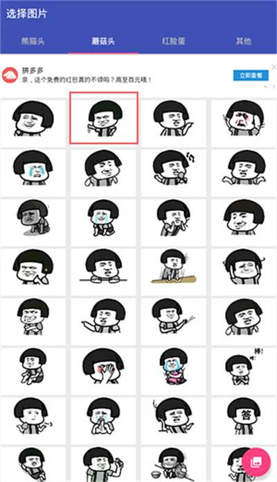 2.这里有热门的图片表情形象,如蘑菇头,熊猫头,红脸蛋等,点击你要制作的图片表情。
