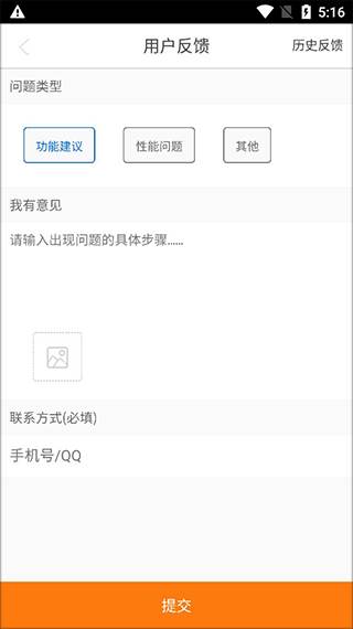 进入用户反馈界面,选择问题类型、输入反馈内容、上传图片、联系方式,点击【提交】。